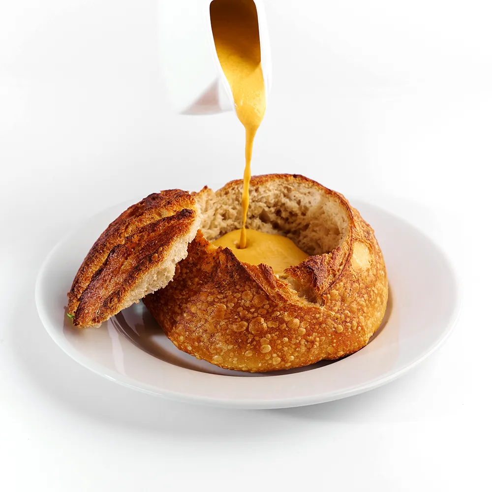 Bowl de pan artesanal con tapa para servir crema.