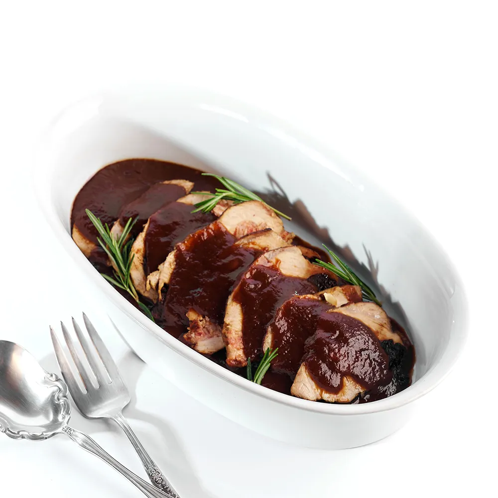 Lomo de cerdo mechado en salsa de ciruela y vino tino,