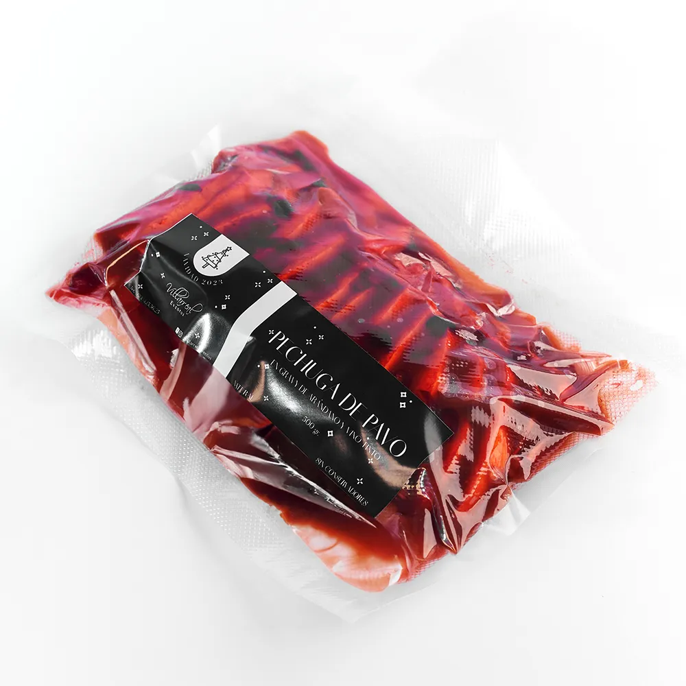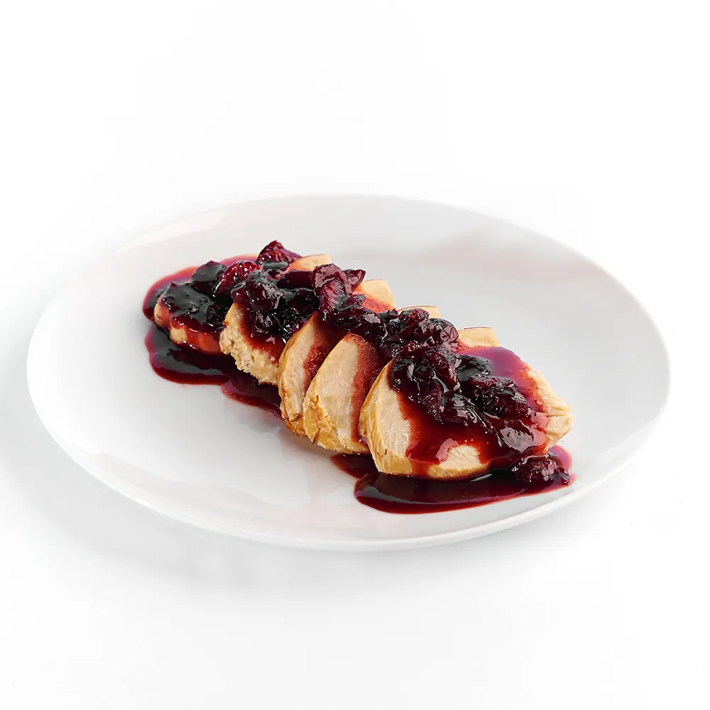 Pechuga de pavo rebanada con gravy de arándanos y vino tinto.