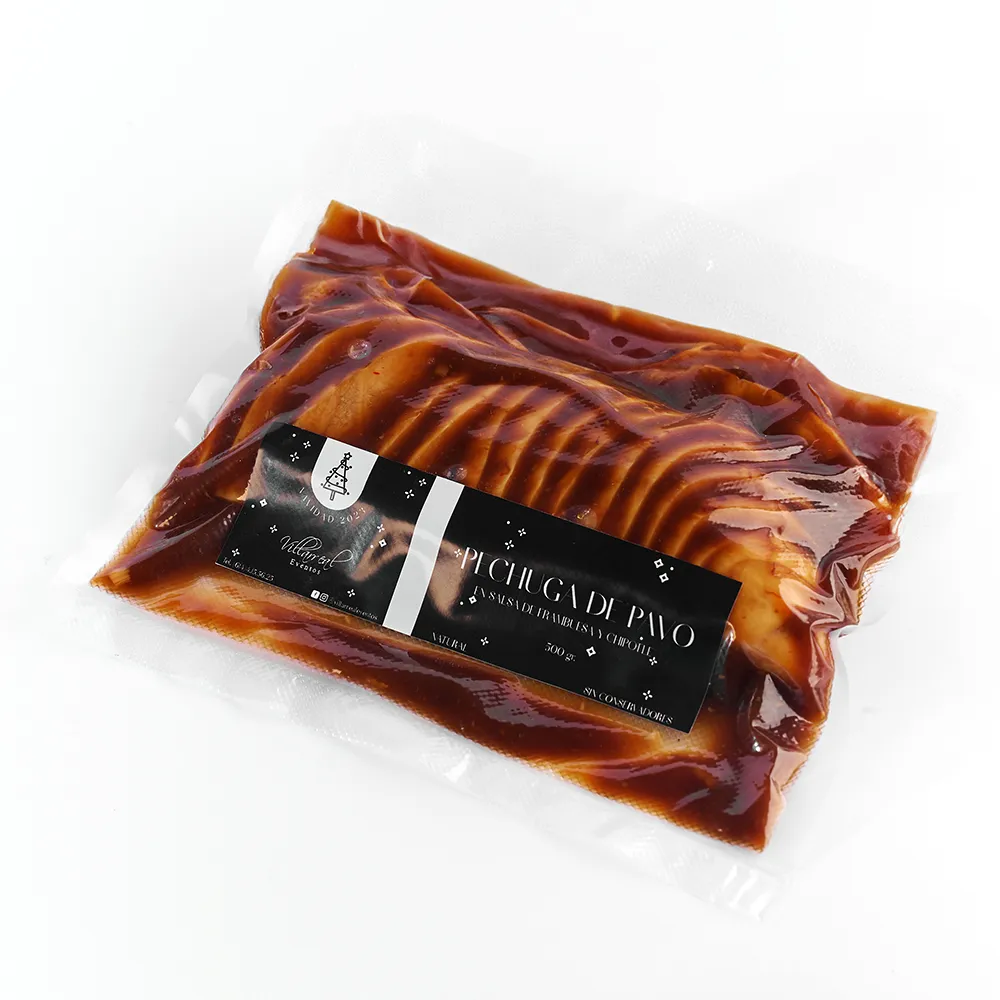 Pechuga de pavo rebanada con salsa agridulce de frambuesa y chipotle.