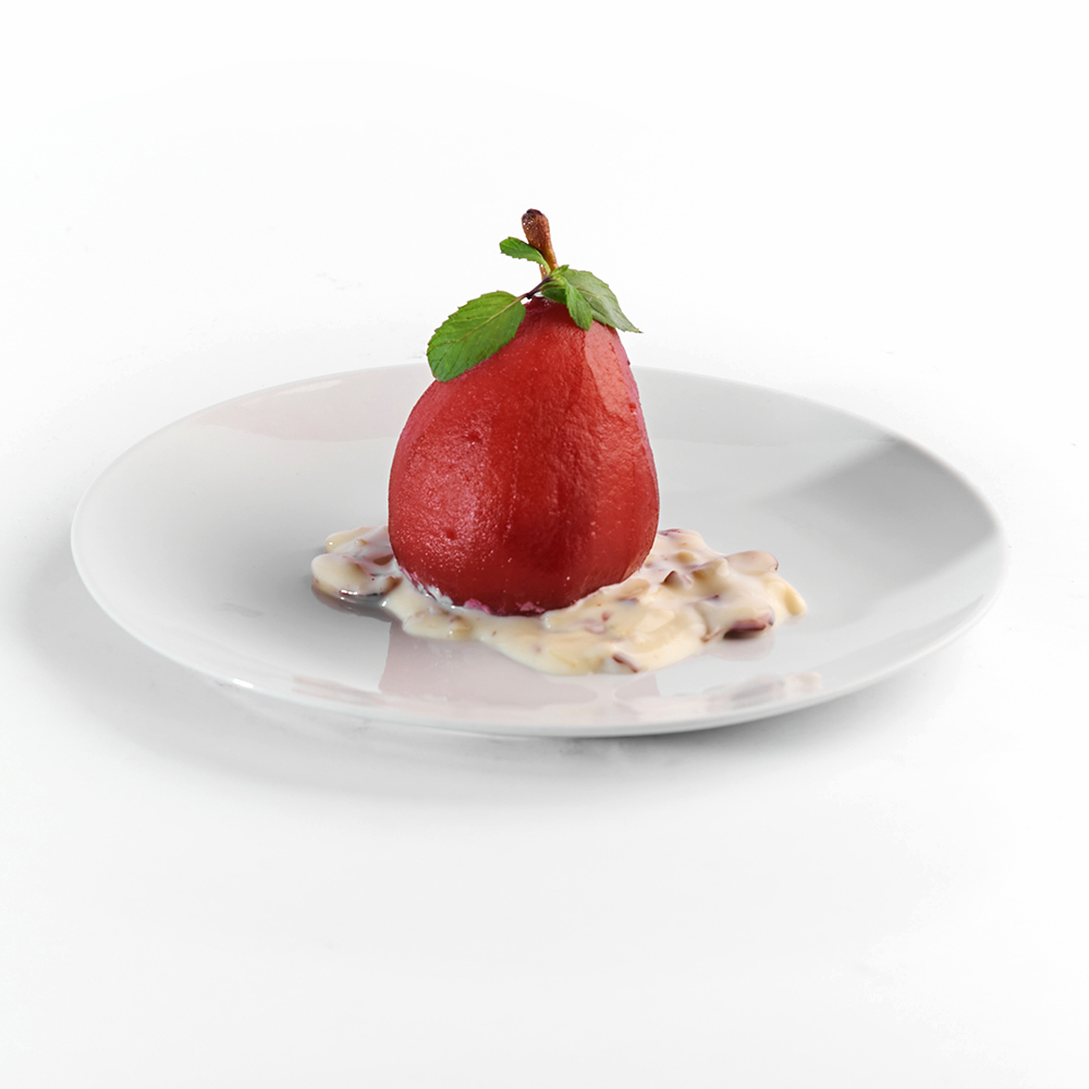Pera pochada en vino tinto sobre salsa de almendra.